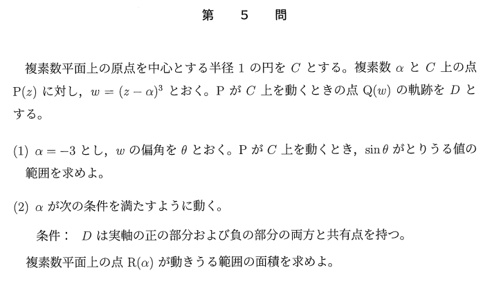 という評価になりました。いわゆる超難問と呼べるほどの難問はありませんでしたが、比較的方針が立ちやすく解きやすい第2問の確率を除くと、どの問題もすぐに方針が浮かぶものではなく、一筋縄ではいきません。点数を取りづらいという意味で、史上最難の1つと呼べる難度だと感じました。また、数列の出題がなく、図形と方程式や複素数平面などの座標幾何に偏っていて、計算がかなり重いものが多いのも特徴でした。