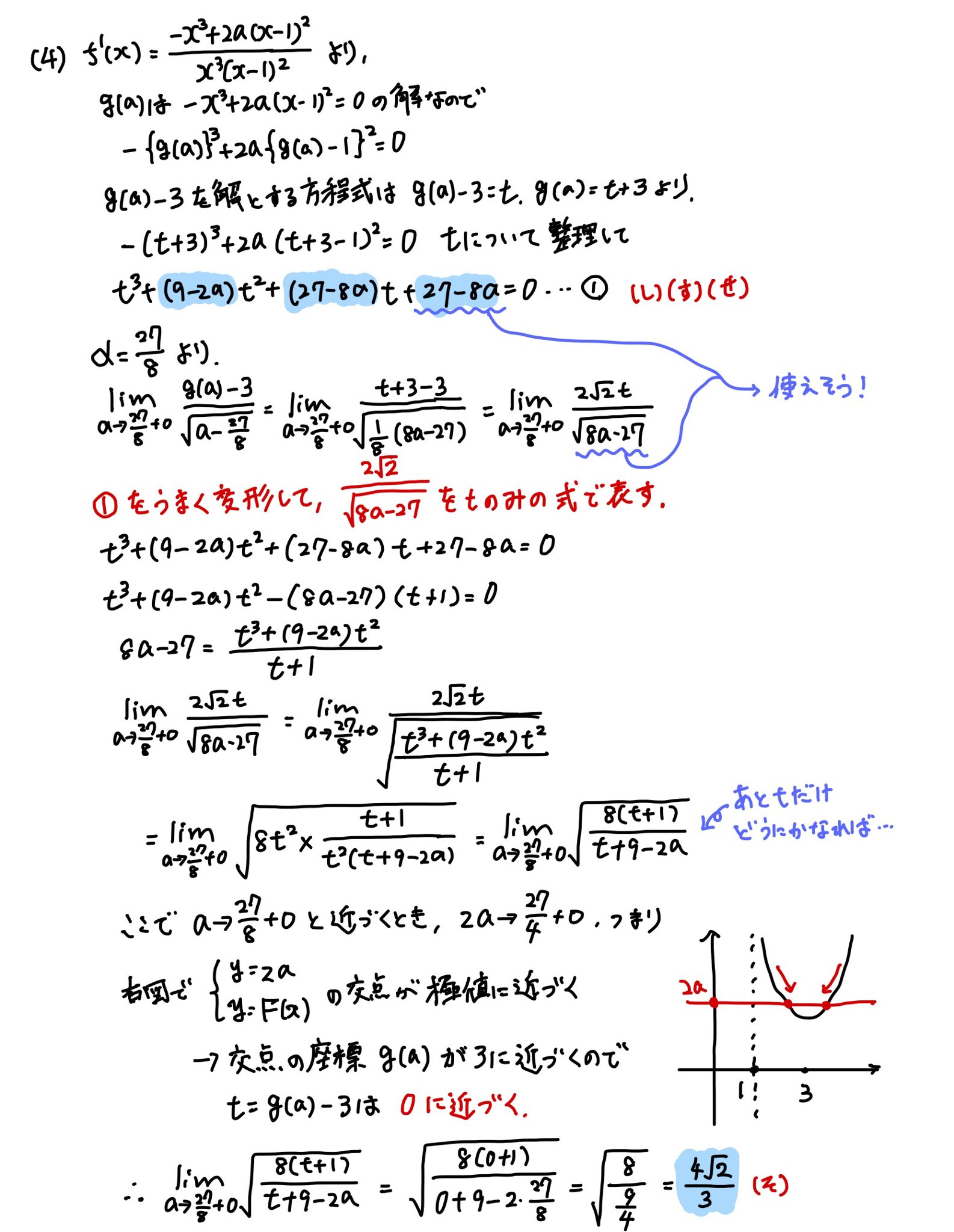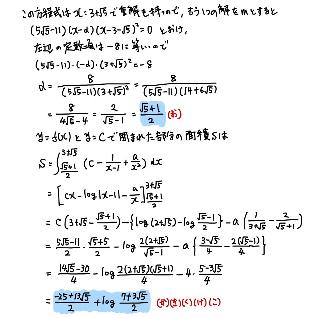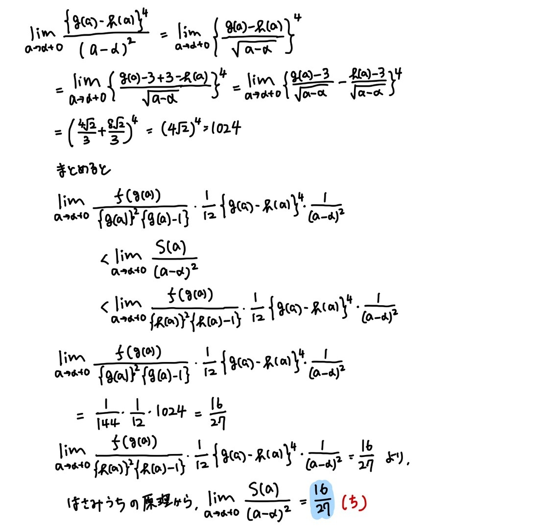 (4)は、計算処理以外の部分も難しいです。g(a)-3を処理するのに、(し)(す)(せ)の誘導をどう使うかが思い付きにくく、思いついたところで、その後の計算も重たいです。