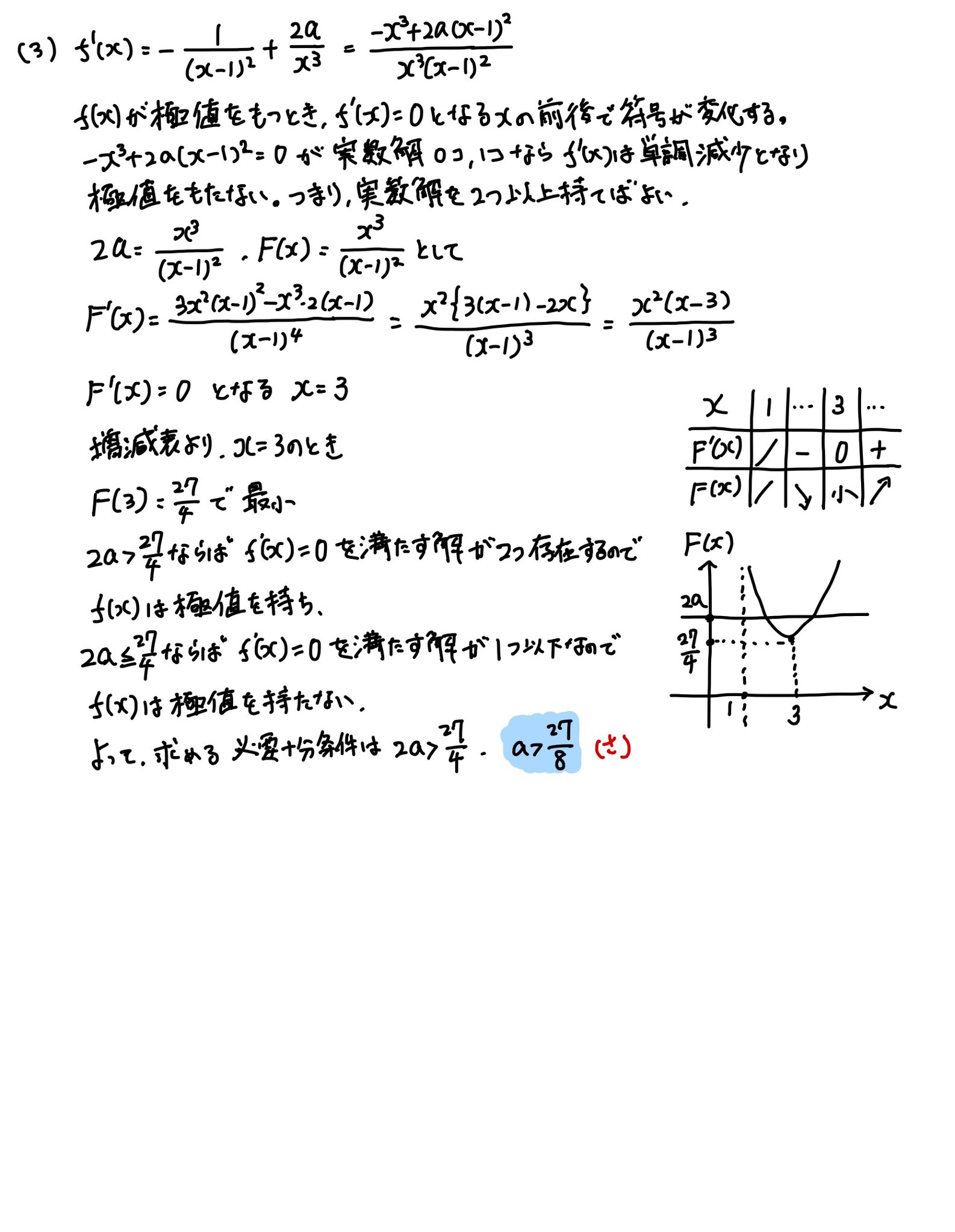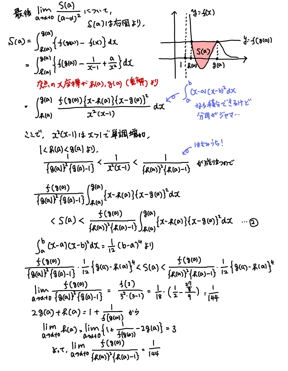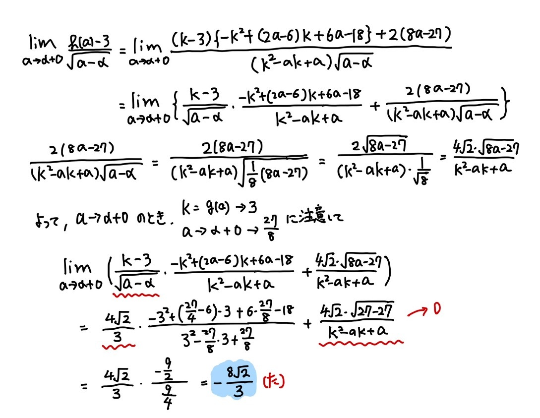(4)は、計算処理以外の部分も難しいです。g(a)-3を処理するのに、(し)(す)(せ)の誘導をどう使うかが思い付きにくく、思いついたところで、その後の計算も重たいです。